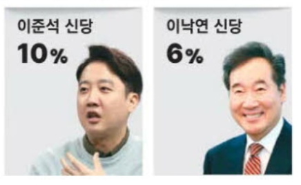 가장 먼저 창당에 성공했었고 지난 1~2일 실시한 정당 지지도 조사를 보면, 이준석 신당은 10% 지지율을 얻었다. 이낙연 신당'이 얻은 6%의 지지도다.
