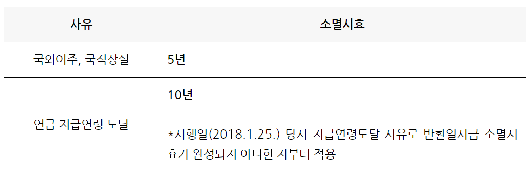 국외이주의 목적이 아닌 취업, 학업 등 기타사유로 외국에 체류하는 경우에는 기간과 상관없이 반환일시금을 지급받을 수 없습니다.