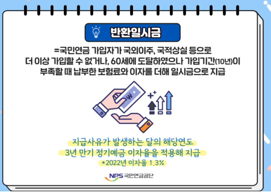 반환일시금은 가입기간 중 본인이 납부한 연금보험료에 대통령령으로 정하는 이자를 더해 받게 되는데요. 적용 이자율은 연금보험료를 낸 날이 속하는 다음 달부터 지급연령도달 등 지급사유발생일이 속하는 달까지 기간에 대해 해당 기간 3년 만기 정기예금 이자율을 적용합니다.