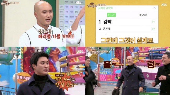 빡빡이 윤성호가 한 달간 기른 주변머리를 최초로 공개하자 이경규와 강호동은 자지러졌다.
