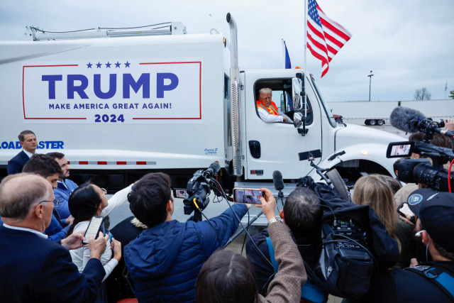 트럼프는 트럭 조수석에서 기자들에게 "내 쓰레기 트럭이 마음에 드느냐"며