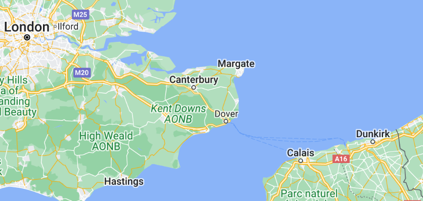 아래 사진을 보시면 캔터베리 아래에 도버 지방과 칼레(Calais)는 참 가깝네요.