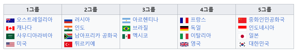G20의 각 나라들은 5개의 그룹으로 나뉘어 있는데 대륙별로 구별되기도 하지만 1그룹과 2그룹의 경우에는 딱히 그러한 원칙은 없다고 볼 수 있다.