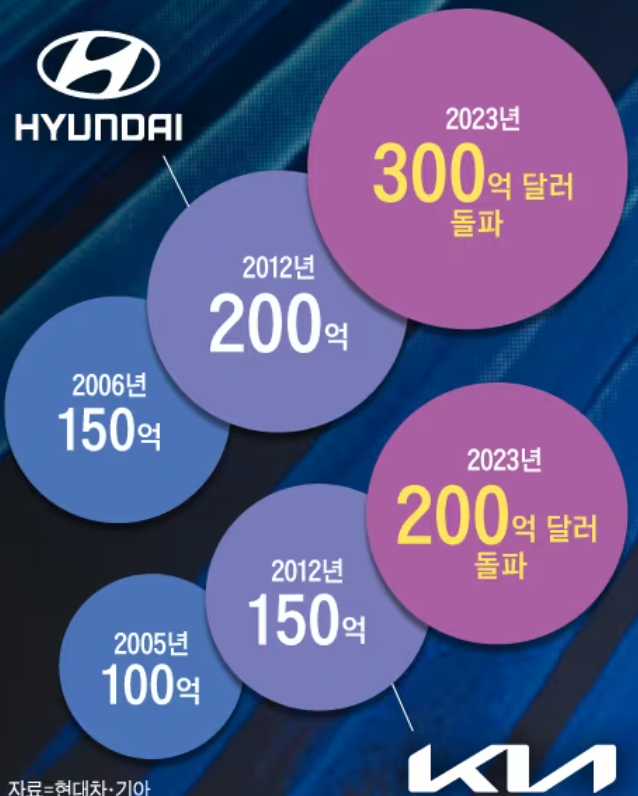 현대차는 1년간 310억2000만달러, 기아는 234억8000만달러 만큼의 자동차를 수출했습니다. 결국 현대기아자동차는 총 545억달러, 우리 돈으로는 무려 71조1225억원을 벌어들인 셈이죠. 이는 지난 11월까지 최근 1년간 우리나라 전체 수출액(6299억달러)의 약 8.7% 규모 입니다.
